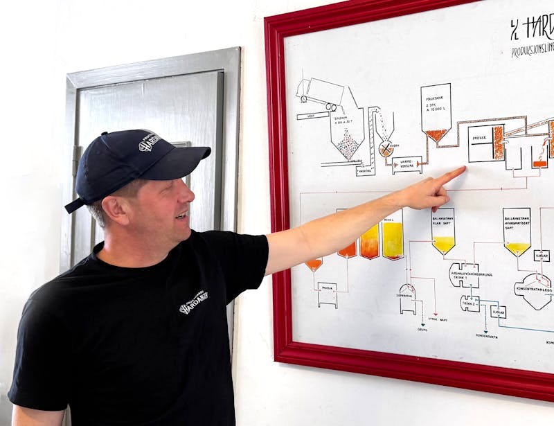 Når juice blir pressa og dampa, forsvinn noko av aromaen. Men vi klarer å ta vare på han. Og når vi først har fanga aromaen, kan vi faktisk hente han tilbake og tilsetje han igjen i ein konsentratjuice. Men det må vere same frukt. Og same batch. Ingen luftige snarvegar via utlandet. Denne typen aroma blir òg kjøpt inn frå ulike produsentar for å smaksetje boblande mineralvatn.