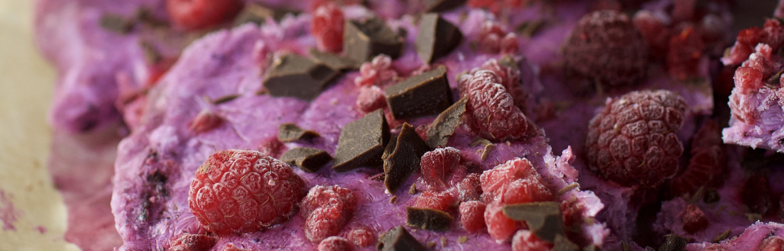 - Fordel yoghurtblandingen jevnt utover et stekebrett ikledd bakepapir. Topp med bringebær, hakket sjokolade, og sett i fryseren i ca 3 timer.