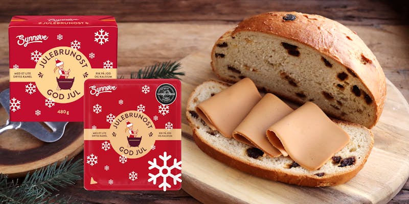 Synnøve Julebrunost er en mild fløtemysost laget av melk, myse, fløte og et lite dryss kanel. Prøv den på vafler, på brødskiva og knekkebrødet eller selvsagt - på julebrød! Den nydelige smakskombinasjonen av karamellisert brunost og kanel får deg garantert i julestemning!